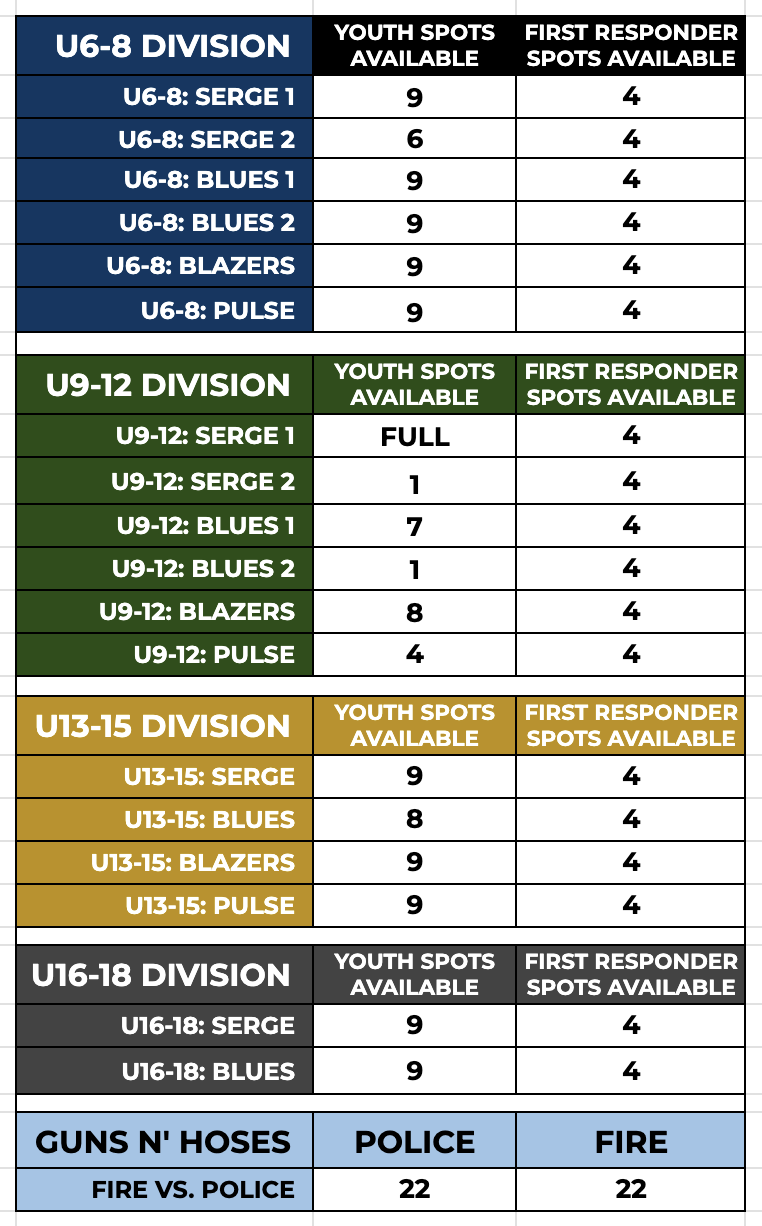 SPOTS ARE LIMITED per team. MAXIMUM: 9 YOUTH & 4 FIRST RESPONDERS per team.